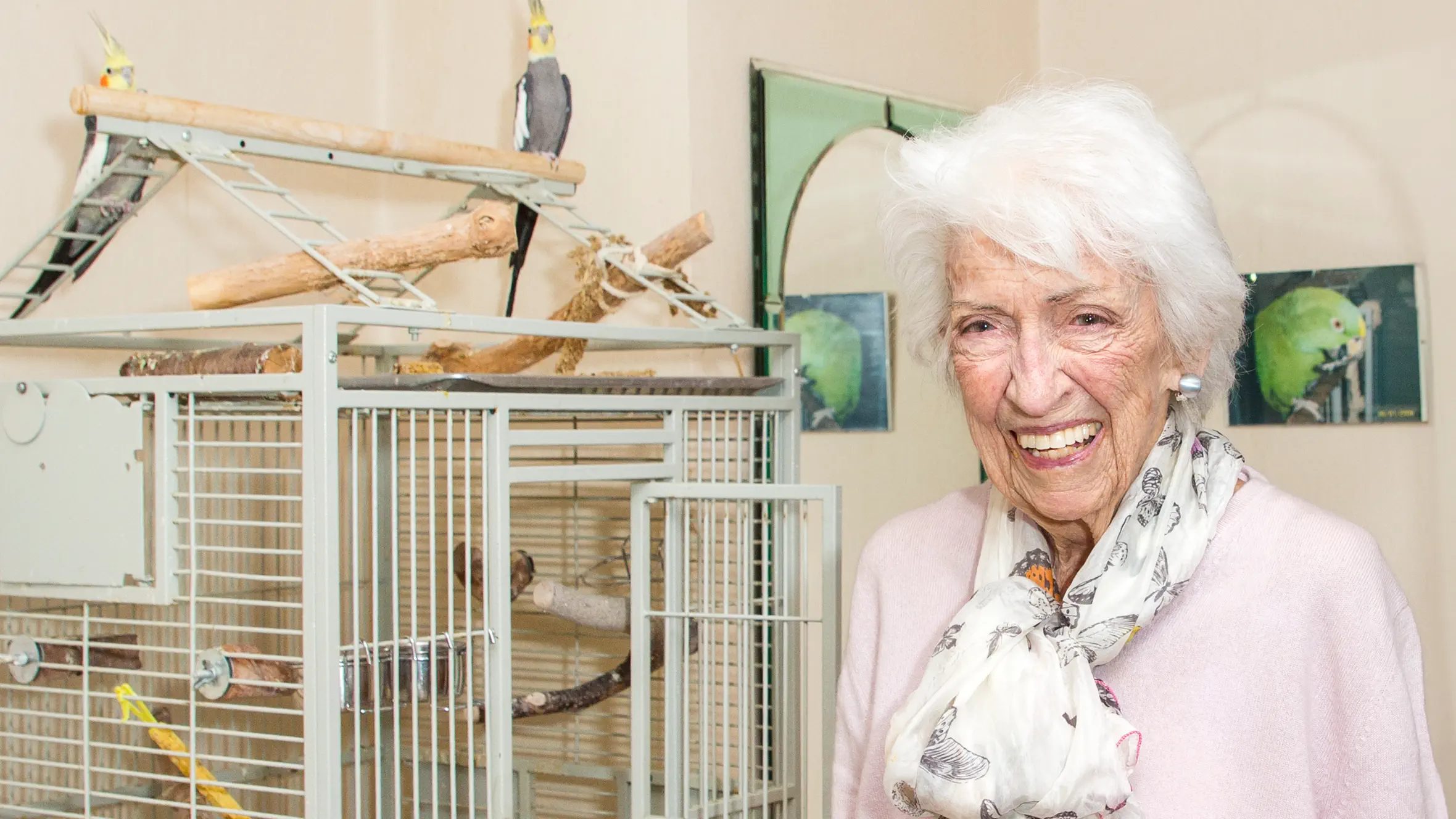 Dank des Pflegedienstes lebt Irmgard Biegler weiterhin in ihrer Wohnung – zusammen mit ihren zwei Nymphensittichen, die hier frei umherfliegen. Bis vor zwei Jahren versorgte sie noch einen Schäferhund, den sie mit ihrem verstorbenen Lebenspartner gehalten hatte. Mit ihm war sie viel unterwegs: im Sommer am Staffelsee, im Winter beim Skifahren in den Bergen. „Ich war schon immer beweglich“, sagt sie stolz. Auch heute ist die lebensfrohe 99-Jährige oft mit dem Rollator unterwegs – zum Einkaufen, in ihre Lieblingsboutique, wo sie sich mit Kleidung und Accessoires in ihren Lieblingsfarben versorgt. Sie pflegt viele Kontakte und besucht fast jedes Wochenende das „Stüberl“ zum Schweinsbraten mit Knödeln und Salat. Friseurin und Manikeurin kommen inzwischen zu ihr nach Hause. „Da gibt es immer viel zu erzählen“, sagt sie. Auch Nachbar:innen schauen vorbei – und doch: „Der Tag ist lang“, räumt sie ein. Eine Makuladegeneration erschwert ihr den Alltag. Besonders stolz ist sie auf eine Spezialbrille, die Dokumente und Zeitung vorliest. Sie hörte im Fernsehen davon, forschte nach und setzte durch, dass die Krankenkasse das Gerät leiht. Bewegung bleibt ihr Prinzip – selbst bei großer Hitze: Dann sprüht sie alle drei Stunden ihre Vögel mit Wasser ab. „Tiere waren und sind mein Ein und Alles.“ Was ihr langes, aktives Leben ausmacht? Sie lacht: Humor!