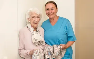 „Wir haben uns viel zu erzählen und wir beide lachen viel“, sagt Irmgard Biegler über Alesia Salauyova vom Pflegedienst Bogenhausen, die sie regelmäßig betreut. „Ich freue mich jeden Morgen auf ihren starken Kaffee.“ Danach richtet die Pflegehelferin die Medikamente her, hilft beim Duschen und Anziehen der Kompressionsstrümpfe. „Seit dem letzten Krankheitsschub isst Frau Biegler weniger und trinkt zu wenig“, sagt die Pflegehelferin. „Ich achte auf ihre Ernährung, bestelle Trinknahrung mit Vitaminen und Mineralien.“ Seit fünf Jahren arbeitet Alesia Salauyova bei der MÜNCHENSTIFT, zuerst beim Pflegedienst-Stützpunkt in St. Josef, nun im Haus an der Effnerstraße. „Ich wollte Medizin studieren“, erzählt die gebürtige Weißrussin. „Aber das Geld reichte nicht. Ich ging als Au-pair nach Deutschland, wollte für das Studium sparen – dann lernte ich meinen Mann kennen.“ Als die Kinder größer wurden, stieg sie bei der Nachbarschaftshilfe ein. „Das passte, ich mochte schon als Kind ältere Menschen – meine Oma starb früh, dafür war ich oft bei einer alten Nachbarin.“ Heute wird sie regelmäßig geschult: zu Themen wie Dekubitus, Sturzprophylaxe, Ernährung oder Mobilität. Pflegefachkräfte stehen ihr beratend zur Seite. „Wichtig ist aber nicht nur das Fachliche“, betont sie, „sondern auch die Gespräche. Nur so erfährt man, was den Menschen wirklich wichtig ist.“